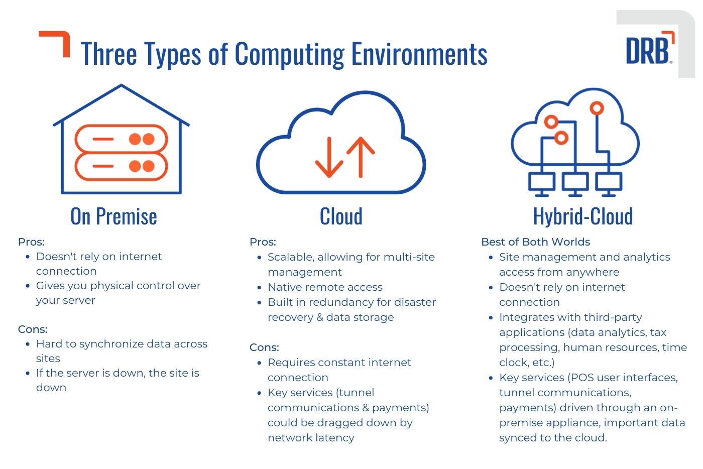 Owners will likely encounter POS solutions that operate on one of three computing systems: on-premises, cloud and hybrid-cloud. Each system offers its own set of pros and cons.