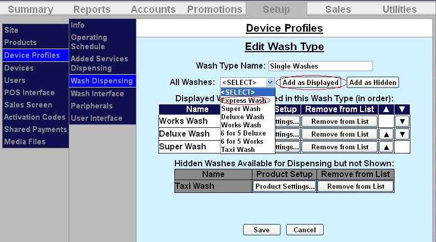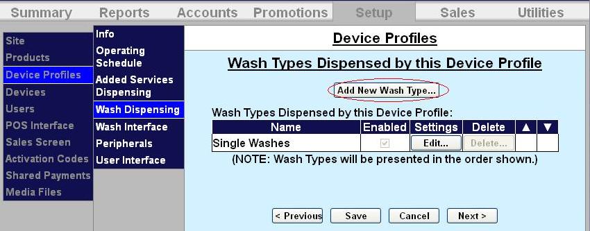 page through the Setup tab of the Sierra management system. Each product is unique to a particular wash type (a product can not be offered in both Wash types). - Add the wash type and wash package through the Wash Dispensing function of the device profile.