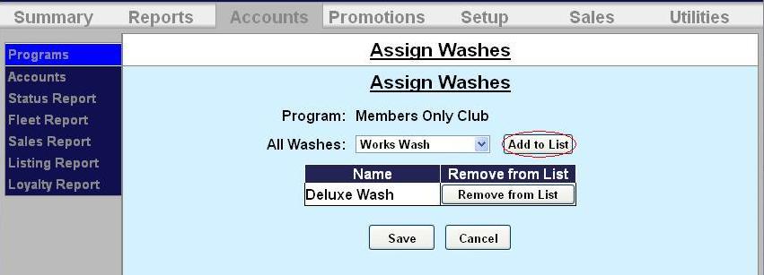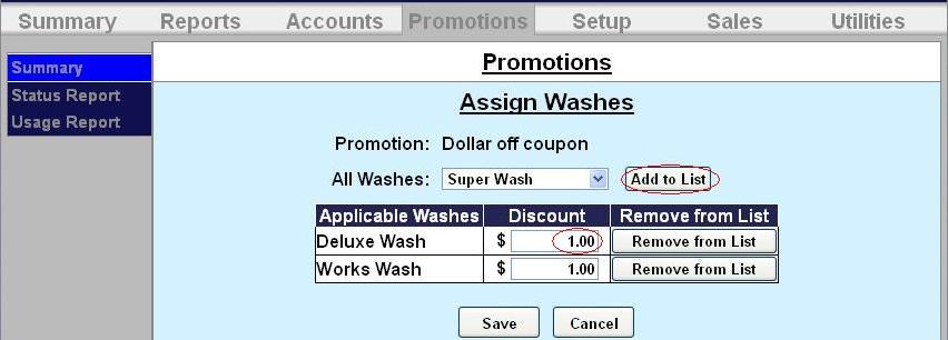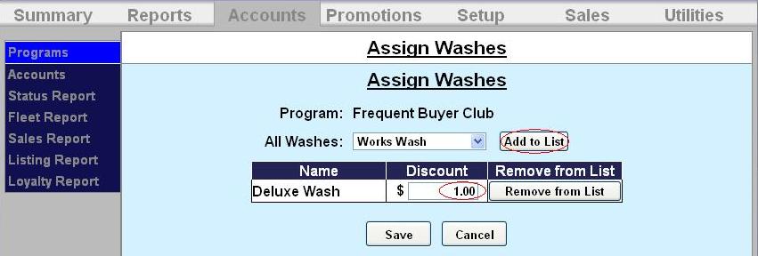 - Select a wash package to be discounted from the drop-down menu and click Add to List.