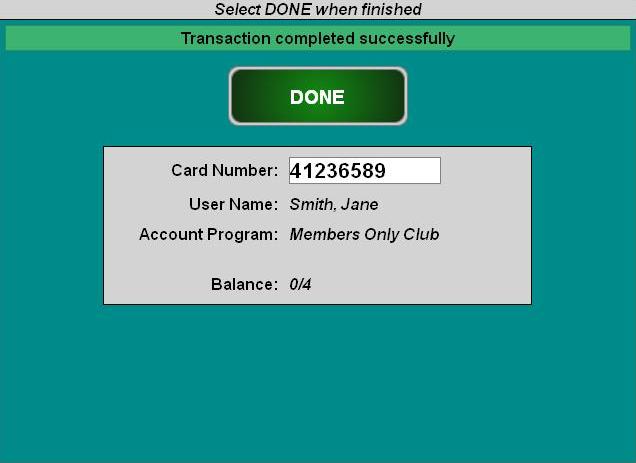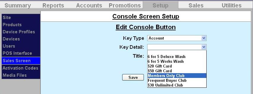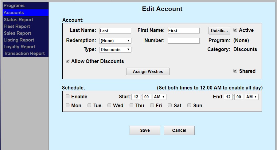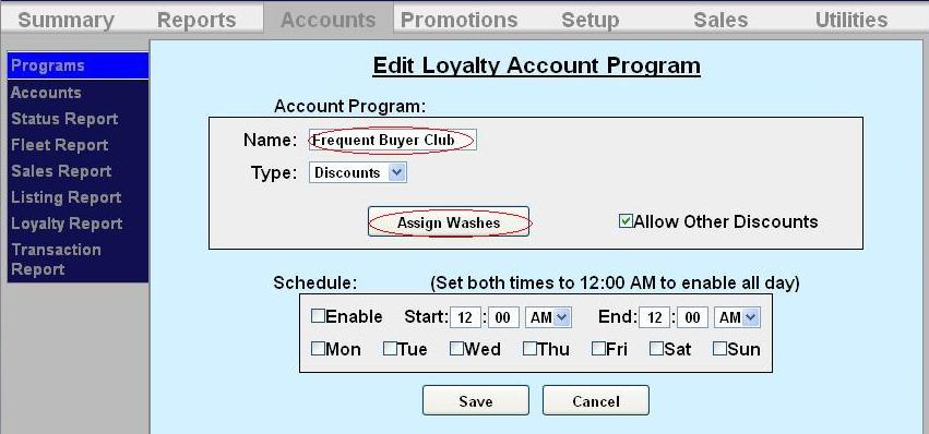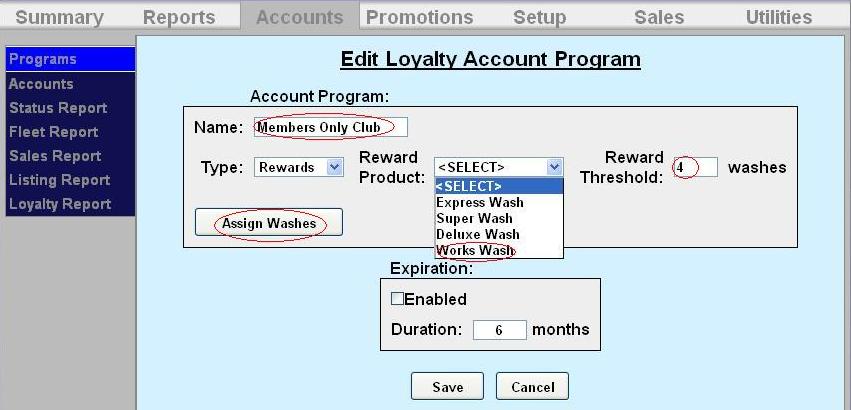 Loyalty accounts provide incentives to “members” in order to encourage repeat visits. This feature offers two different programs: member discounts and frequent shopper rewards. The discount application entitles club members to discounts on one or more wash products. The frequency application functions as an “electronic punch card” that provides rewards for repeat customers (e.g. buy 4, get the 5th for free). A program must be setup for both options.
