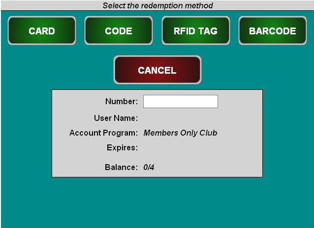 - Redemption method – select code, card, barcode or RFID from the drop down menu.