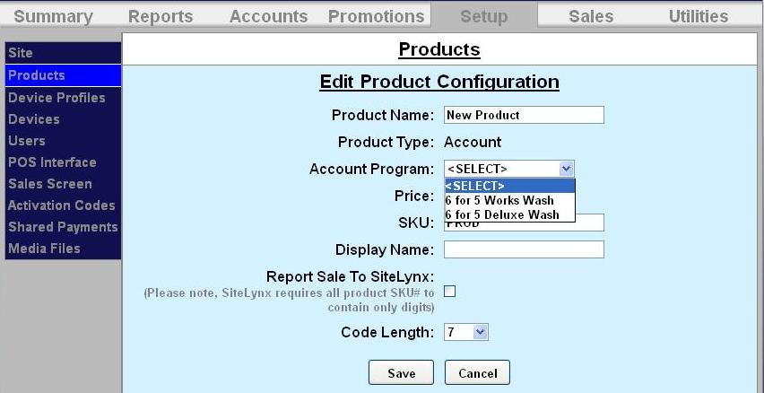 - Select product-based account from the drop-down menu. A product-based account is useable for only (1) wash product (which is selected from a drop down list). NOTE: A bundled wash package is product-based.