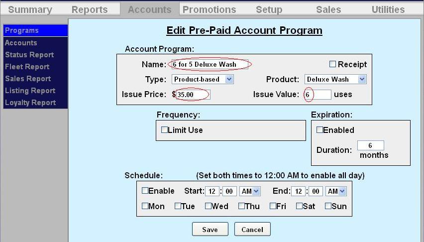 Enter the Issue Price (or selling price) that will be reported when a new account is issued (or sold) and then enter number of washes for which the account can be redeemed.