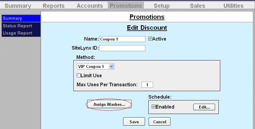 Discounts are a monetary amount subtracted from the regular wash price. Discounts can be configured so the value varies by wash package. The methods for redeeming a discount include code entry, coupon (inserted at the Bill Acceptor) or token. You may also limit the use of the discount via scheduling or limiting the uses per visit/day, etc.