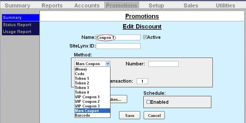 - Select the method of redemption from the drop-down menu. For discounts the methods are: Codes, Tokens 1-4, and VIP Coupons 1-3 (Coinco) aand Mars Coupon. If Mars Coupon is selected, you will need to enter the 4-digit code from the coupon.