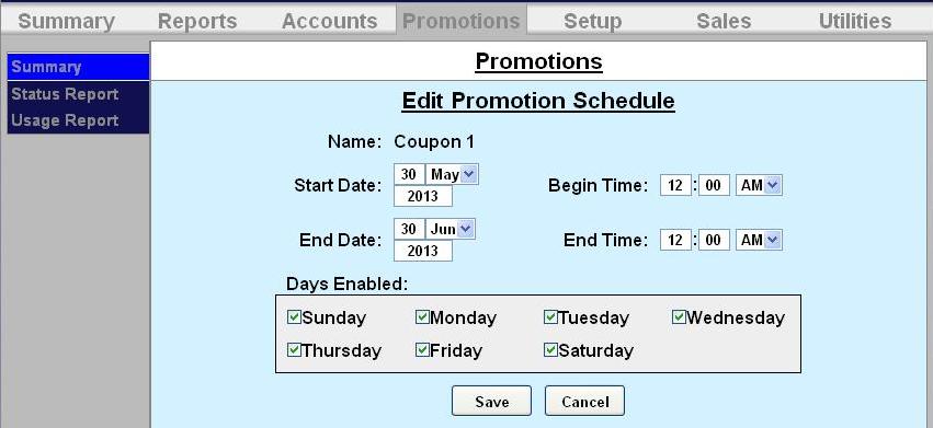 - If you want the promotion to only run on certain days, under Schedule, click Enabled. Fill out the times and days on the subsequent screen. Click Save.