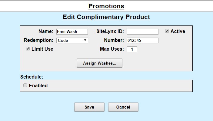 The complimentary (free) wash promotion provides a free wash when redeemed. Like the discount, this promotion can be configured for redemption by a code, paper coupon or token. The complimentary wash can also be set with a schedule to limit the days and/or hours when it can be used.