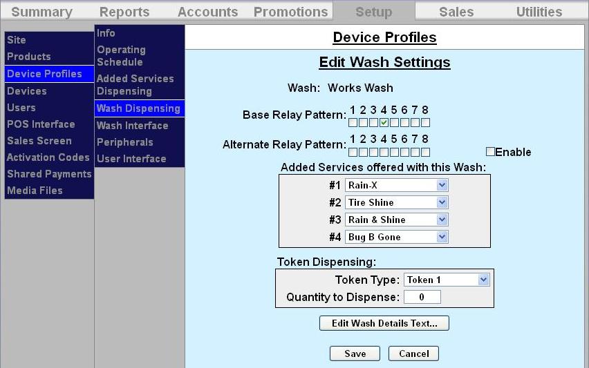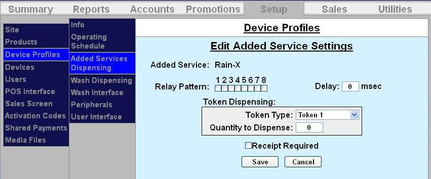 - Add the added services to the Added Service Dispensing function of the device profile. Note — it may be necessary to install additional wires from the kiosk to the car wash controller to accommodate the inputs for added service selections.