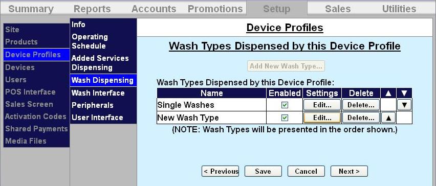 Go to the Setup tab, then to Device Profiles in the left frame. Select the device profile where you would like to add the added service (Portal, Sentinel, C-Start) and click Edit by the device name. Then click on Wash Dispensing in the left frame.