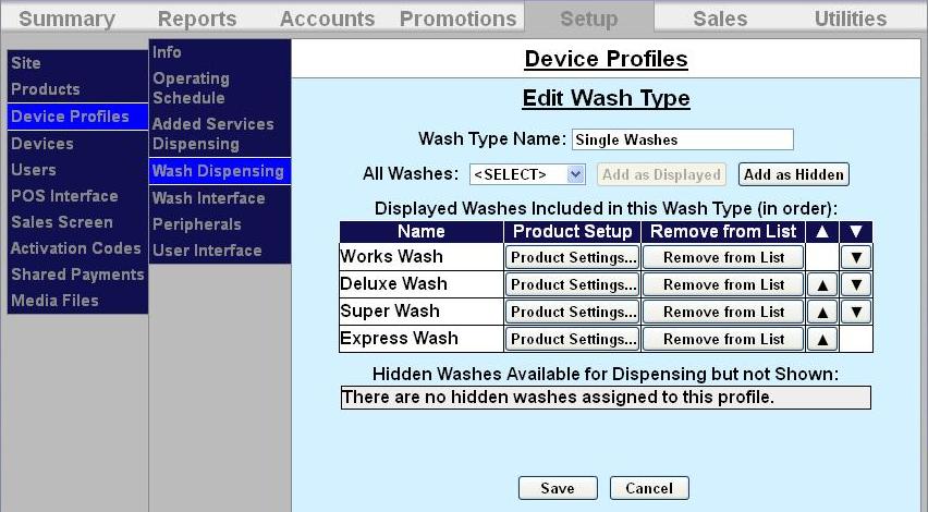Go to the Setup tab, then to the device profile where you will configure the added services dispensing (Portal, Sentinel, C-Start, Wash Select II) and click Edit by the device name. Then click on Added Services Dispensing in the left frame.