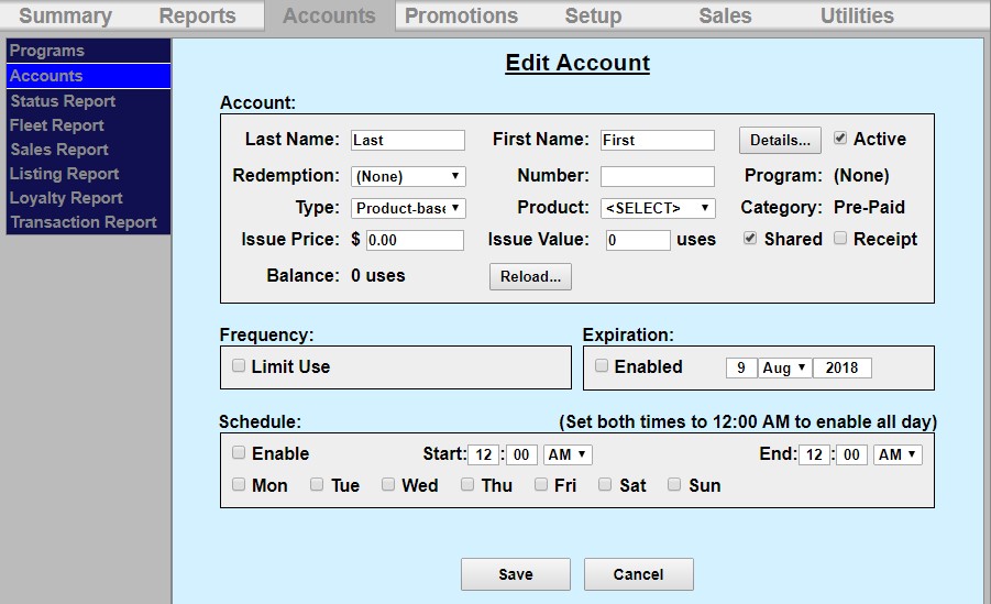 Select Pre-paid from the drop-down menu below the table and click Add New Account Program. The Edit Account screen will be displayed.