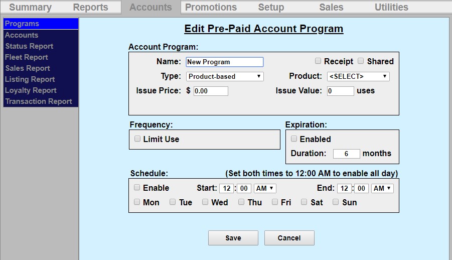 To setup a new pre-paid account program, go to the Accounts tab, then select Programs from the left frame.