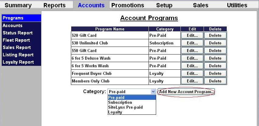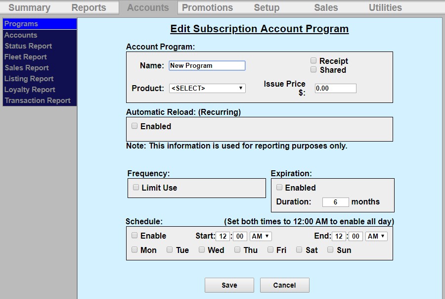 To setup a new subscription account program, go to the Accounts tab, then select Programs from the left frame.