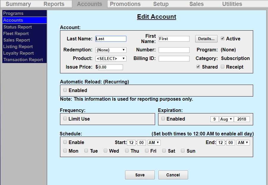 If you wish for the account to have an expiration date, click Enable, then enter the duration of the account program. NOTE: This schedule runs in calendar months. The account will expire on the last day of the month, not 30 days from the issue date.